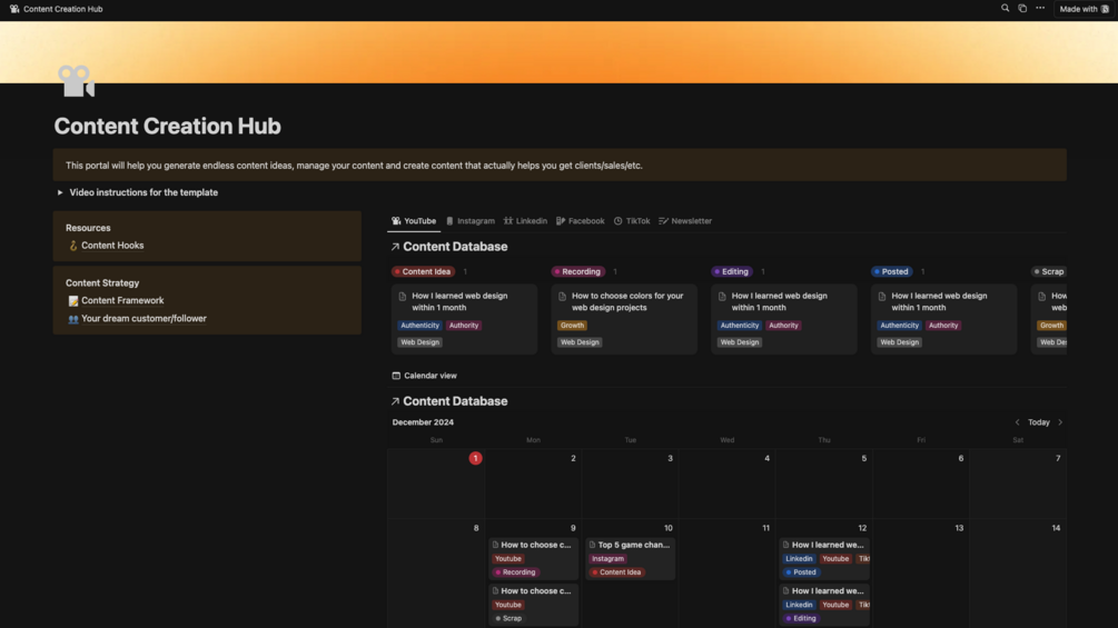 This template is perfect for freelancers who are either just beginning their content creation journey or looking to establish a reliable system to create and share content consistently. Whether you're seeking to attract high-value clients, grow your audience, or streamline your creative process, this template will help you achieve your goals with clarity and efficiency.